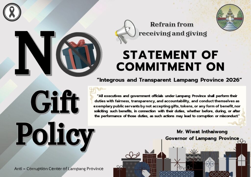 ประกาศเจตนารมณ์ “สุจริตโปร่งใส จังหวัดลำปางใสสะอาด 2569 “และงดรับ งดให้ ของขวัญ ของกำนัลทุกชนิดจากการปฎิบัตคิหน้าที่ “No Gift Policy” By admin - ธันวาคม 30, 2025 9 Loading... Taking too long? Reload document | Open in new tab